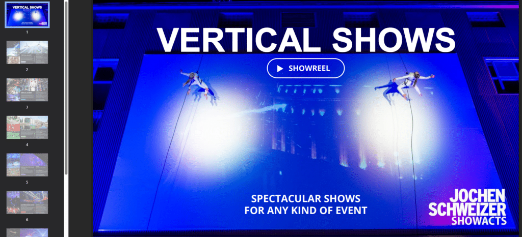 Bei dieser Show interagieren Künstler live mit vertikal in Szene gesetzten Videoeffekten. Diese projizieren perfekt abgestimmte Inhalte und schaffen ein Gesamterlebnis, das Augen und Ohren begeistert. Jochen Schweizer Showacts nutzen vertikale Perspektiven, um Ihre Marke großartig in Szene zu setzen. Egal, ob auf Leinwänden oder Fassaden – die visuellen Effekte fesseln alle Zuschauer und sorgen für einen bleibenden Eindruck.